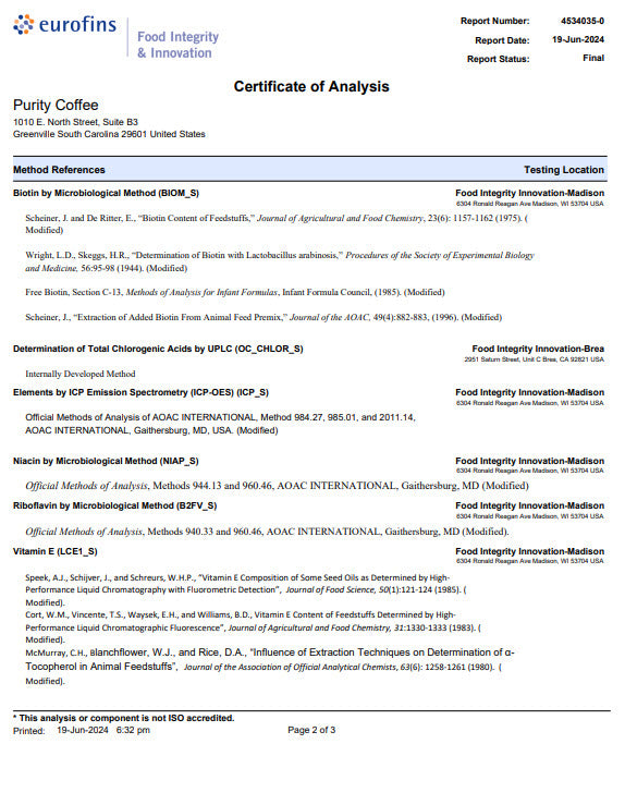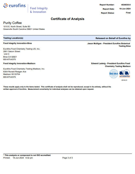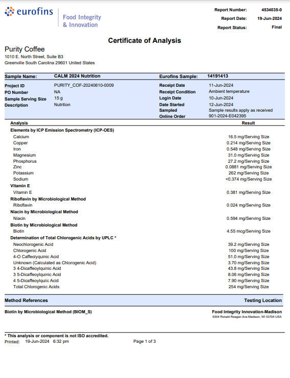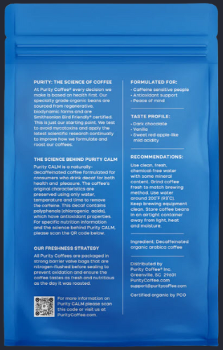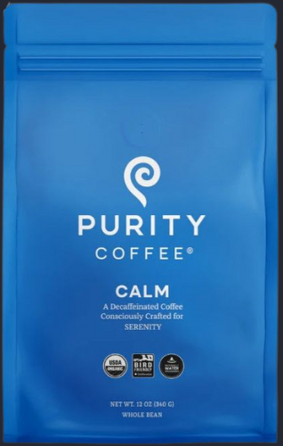 We take our decaf seriously because we want to honor those of you who love coffee and want to drink it for both pleasure and health benefits but do not want the caffeine that naturally occurs in coffee. Purity CALM is made of the same highly vetted coffee we use in our other blends, and we send the coffee directly from the farm to the Swiss Water® decaffeination facility in Canada. The proprietary Swiss Water® Process (SWP) yields a coffee that is more than 99.9% caffeine-free, which is the best in the industry. In addition, our roasting partner makes sure to clear the roasters of any leftover regular coffee before doing a run of Purity CALM and roasts the decaf to a level that retains the chlorogenic acids (CGA) and a balance of sweetness and subdued acidity. The result is the highest quality decaf on the market: specialty grade, certified organic, Smithsonian Bird Friendly, regeneratively farmed, and SWP decaffeinated.