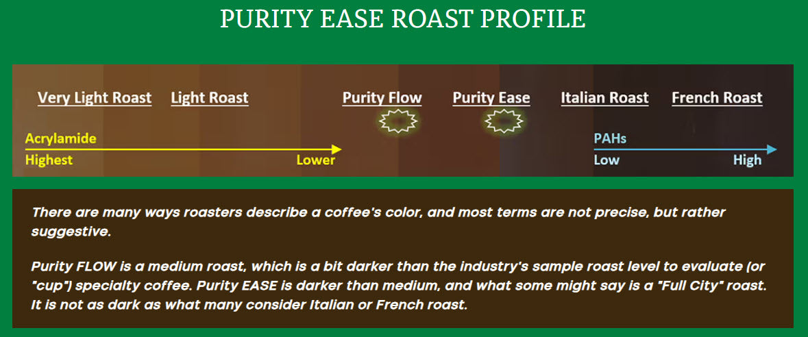 - After being formed, acrylamide tends to decrease as roasting progresses. Purity EASE has even lower acrylamide than Purity FLOW.